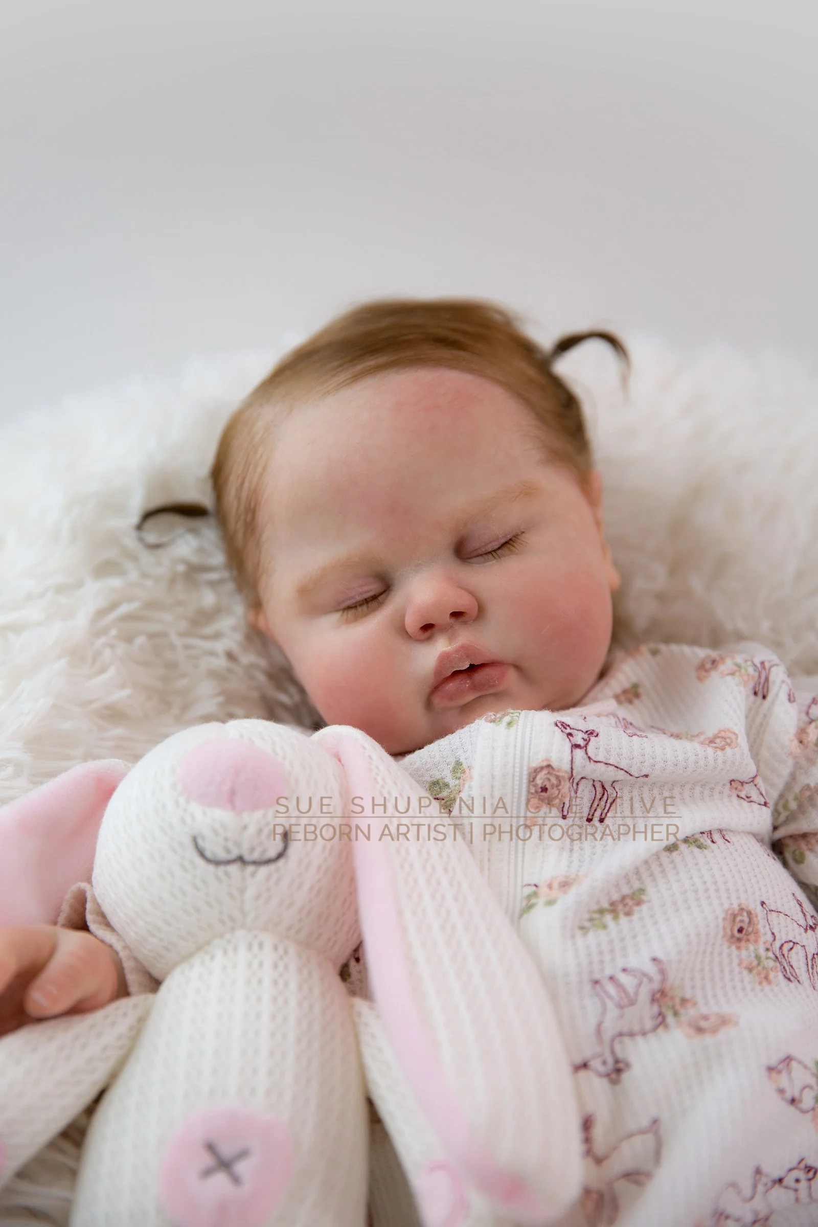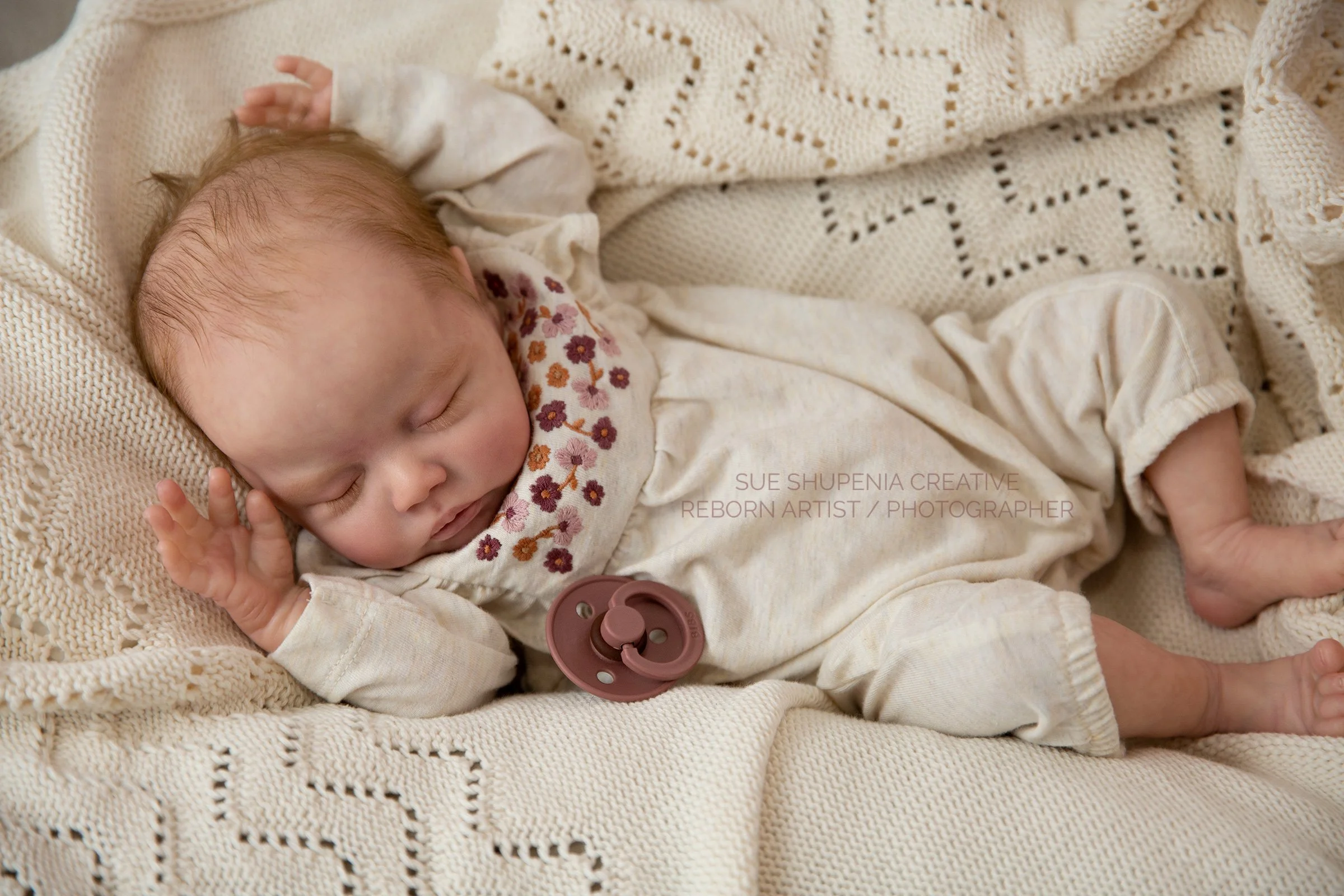 Sue does amazing work, she is a very talented artist. My babies are absolutely beautiful. The details are stunning. I especially enjoy the fine painted baby hairs in addition to the rooted hair and the subtle veins painted underneath the rooted hair. The babies are very photogenic and very realistic. I highly recommend.
